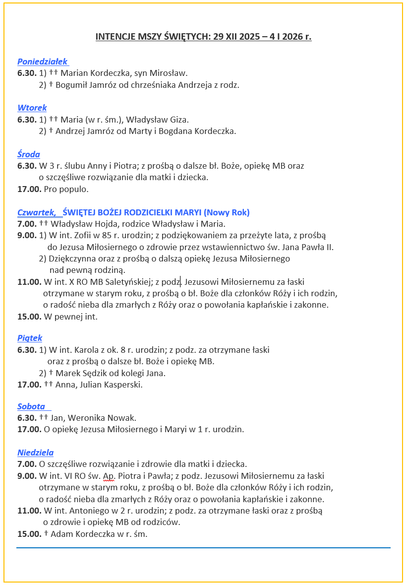 INTENCJE MSZY ŚWIĘTYCH: 29 XII 2025 – 4 I 2026 r.